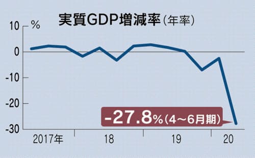 4~6月期は感染拡大を抑えるため、政府が緊急事態宣言を出し、個人の外出や店舗の営業が制限された。個人消費を中心に経済活動が広く滞り、GDPは統計を遡れる1955年以降でかつてない落ち込みとなった。