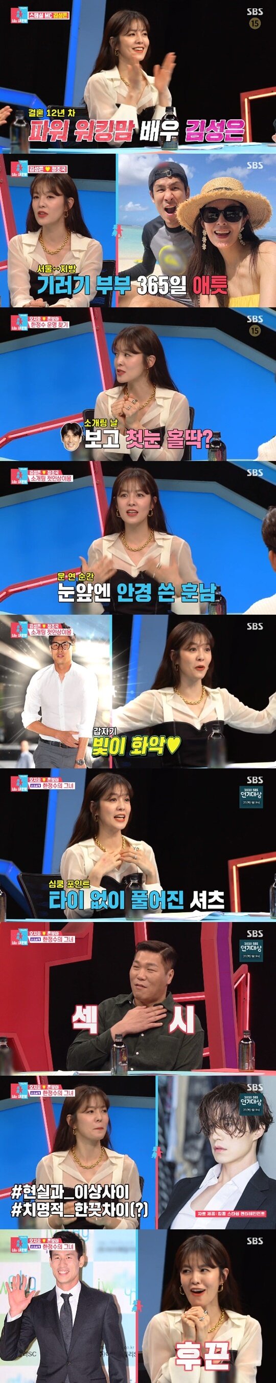 오랜 기러기 부부 생활을 청산하고 뒤늦은 신혼생활로 행복을 만끽 중인 김성은은 정조국이 넥타이 없이 풀어진 셔츠를 입고 있을 때 섹시하다고 전하며 애정을 드러냈다. 김성은은 "연애할 때 행사 갔다가 그렇게 온 적 있는데 너무 멋있더라"며 "집에서도 정장만 입으면 좋겠다"고 너스레를 떨어 웃음을 자아냈다.